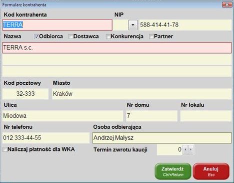 - dodawanie nowych kontrahentów i poprawianie danych dotychczasowych