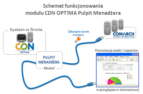 Moduł Pulpit Menadżera to narzędzie, dzięki któremu kadra kierownicza lub właściciel przedsiębiorstwa, z każdego miejsca na świecie, ma dostęp do podstawowych danych finansowych i nie tylko finansowych swojej firmy, zgromadzonych w systemie CDN OPT!MA. Dane są dostępne na zabezpieczonej hasłem stronie internetowej.